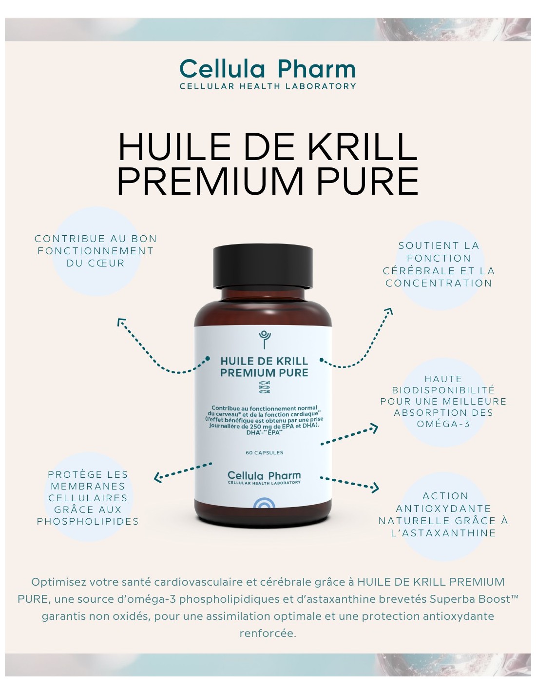 Optimize your cardiovascular and cerebral health with PREMIUM PURE KRILL OIL, a source of patented Superba Boost™ phospholipid omega-3s and astaxanthin guaranteed non-oxidized, for optimal assimilation and enhanced antioxidant protection.