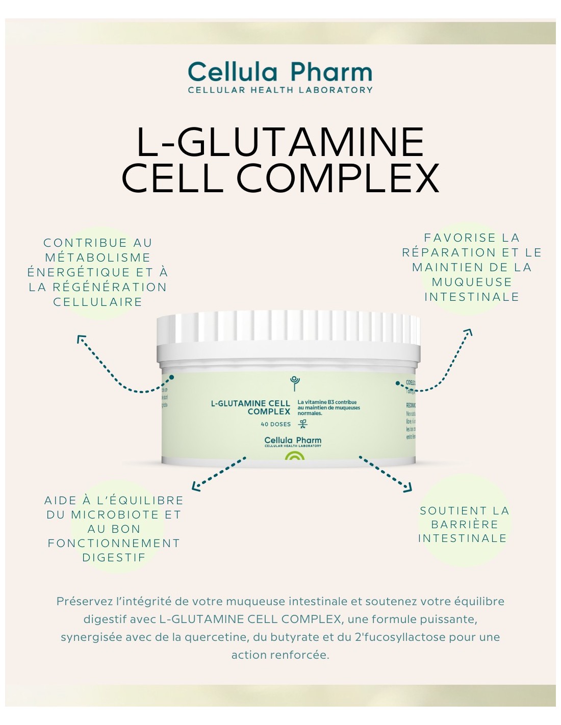 Preserve the integrity of your intestinal mucosa and support your digestive balance with L-GLUTAMINE CELL COMPLEX, a powerful formula synergized with quercetin, butyrate and 2'fucosyllactose for enhanced action.